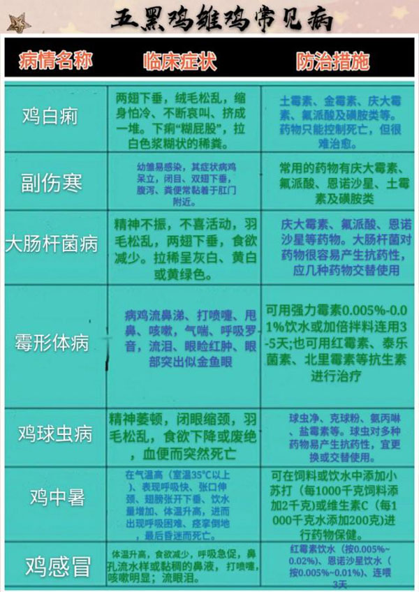 以下是由金寨农肴生态农业小编制作的五黑鸡雏鸡常见病表。